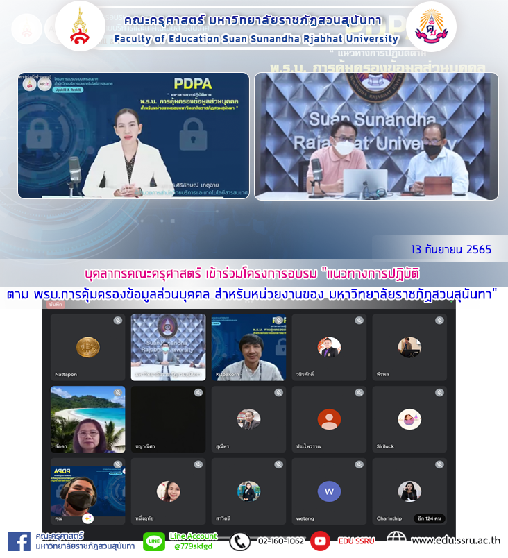 วันอังคารที่ 13 กันยายน 2565 บุคลากรคณะครุศาสตร์ มหาวิทยาลัยราชภัฏสวนสุนันทา เข้าร่วมโครงการอบรม "แนวทางการปฏิบัติตาม พรบ.การคุ้มครองข้อมูลส่วนบุคคล สำหรับหน่วยงานของ มหาวิทยาลัยราชภัฏสวนสุนันทา” ซึ่งจัดโดยศูนย์เทคโนโลยีสารสนเทศ สำนักวิทยบริการและเทคโนโลยีสารสนเทศ ได้รับเกียรติจาก ผู้ช่วยศาสตราจารย์ ดร.ศิริลักษณ์ เกตุฉาย ผู้อำนวยการสำนักวิทยบริการและเทคโนโลยีสารสนเทศ เป็นประธานกล่าวเปิดโครงการฯ และ ดร.เวทางค์ พ่วงทรัพย์ รองปลัดกระทรวงดิจิทัลเพื่อเศรษฐกิจและสังคม เป็นวิทยากรในการบรรยาย ผ่านระบบออนไลน์ Google Meet