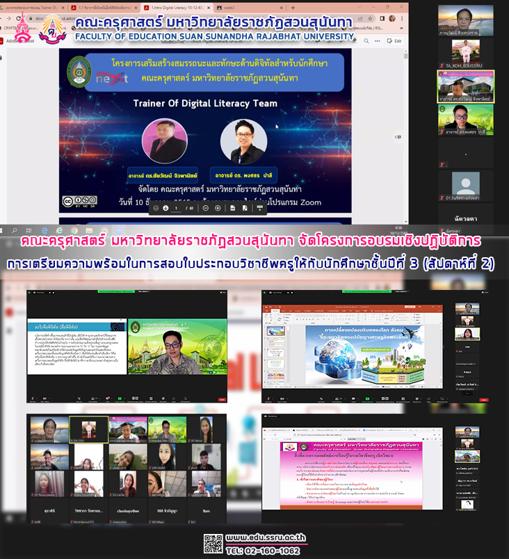 เมื่อวันที่ 10 และ 11 ธันวาคม 2565 เวลา 08.30 - 16.00 น. คณะครุศาสตร์ มหาวิทยาลัยราชภัฏสวนสุนันทา นำโดย อาจารย์ภาณุวัฒน์ ศิวะสกุลราช อาจารย์ประจำกลุ่มวิชาชีพครู จัดโครงการอบรมเชิงปฏิบัติการการเตรียมความพร้อมในการสอบใบประกอบวิชาชีพครูให้กับนักศึกษาชั้นปีที่ 3 วิชาเทคโนโลยีดิจิทัลเพื่อการศึกษา โดยมีวิทยากรในการอบรมดังนี้ อาจารย์ ดร.ชัยวัฒน์ จิวพานิชย์ หัวหน้าสาขาวิชาเทคโนโลยีดิจิทัลเพื่อการศึกษา อาจารย์ ดร.พงศธร ปาลี จากมหาวิทยาลัยราชภัฏราชนครินทร์ และเรื่องการเปลี่ยนแปลงบริบทโลก โดย อาจารย์เพียงฤทัย พุฒิคุณเกษม และเรื่องจิตวิทยา โดย อาจารย์มาลัย ประดับศรี ผ่านระบบออนไลน์ Zoom Meetings