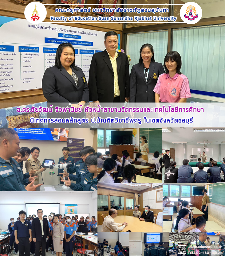 เมื่อวันที่ 12 มิถุนายน 2566 อาจารย์ ดร.ชัยวัฒน์ จิวพานิชย์ หัวหน้าสาขาวิชาเทคโนโลยีดิจิทัลเพื่อการศึกษา คณะครุศาสตร์ มหาวิทยาลัยราชภัฏสวนสุนันทา นิเทศการสอนของหลักสูตร ป.บัณฑิตวิชาชีพครู กับคณะครุศาสตร์ มหาวิทยาลัยราชภัฏสวนสุนันทา ในเขตจังหวัดชลบุรี