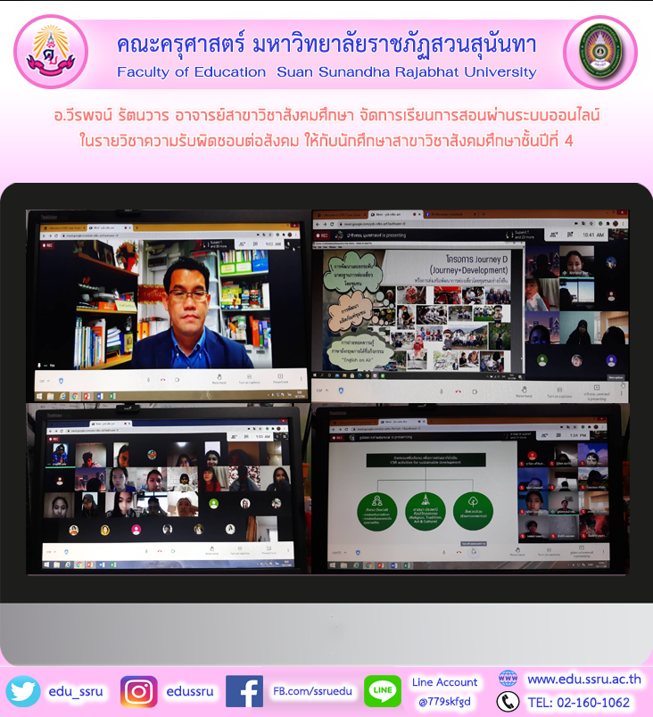 วันที่ 14 มกราคม 2564 อ.วีรพจน์ รัตนวาร อาจารย์สาขาวิชาสังคมศึกษา คณะครุศาสตร์ มหาวิทยาลัยราชภัฏสวนสุนันทา จัดการเรียนการสอนผ่านระบบออนไลน์ ในรายวิชาความรับผิดชอบต่อสังคม ให้กับนักศึกษาสาขาวิชาสังคมศึกษาชั้นปีที่ 4