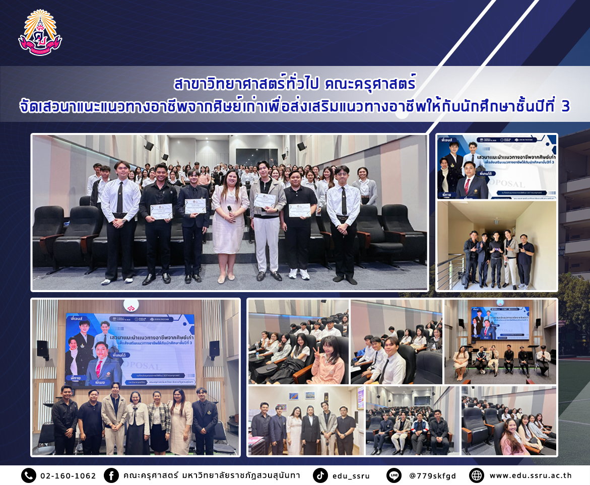 เมื่อวันที่ 13 มกราคม 2569 เวลา 09.00 - 12.00 น. สาขาวิทยาศาสตร์ทั่วไป คณะครุศาสตร์มหาวิทยาลัยราชภัฏสวนสุนันทา จัดเสวนาแนะแนวทางอาชีพจากศิษย์เก่าเพื่อส่งเสริมแนวทางอาชีพให้กับนักศึกษาชั้นปีที่ 3 โดยมี 1. นาย อภิรักษ์ พรหมสุข 2. นาย วันภัทร ละนิโส 3. นาย ชาคริต พุฒศรี 4. นาย วงศธร ปานมาศ เป็นวิทยากร และ อาจารย์ ดร. ธัชชา ศุกระจันทร์ เป็นผู้รับผิดชอบ