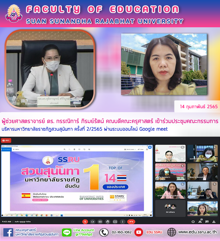 วันจันทร์ที่ 14 กุมภาพันธ์ 2565 ผู้ช่วยศาสตราจารย์ ดร. กรรณิการ์ ภิรมย์รัตน์ คณบดีคณะครุศาสตร์ เข้าร่วมประชุมคณะกรรมการบริหารมหาวิทยาลัยราชภัฏสวนสุนันทา ครั้งที่ 2/2565 ภายในงานได้รับเกียรติจากรองศาสตราจารย์ ดร. ชุติกาญจน์ ศรีวิบูลย์ อธิการบดีมหาวิทยาลัยราชภัฏสวนสุนันทา เป็นประธานในการประชุม ผ่านระบบออนไลน์ Google meet