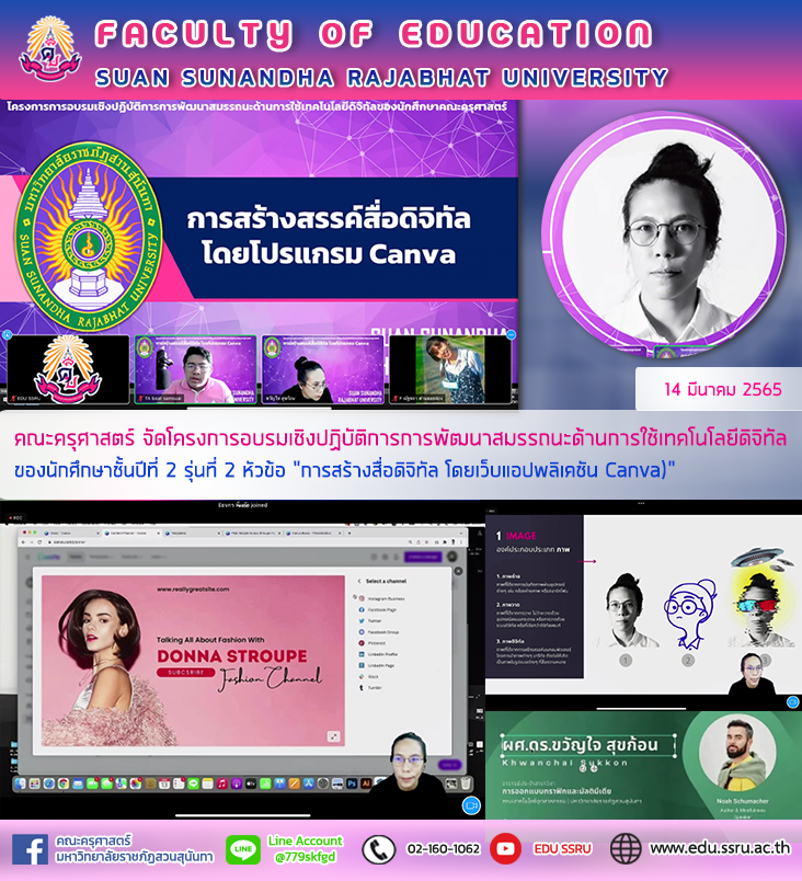คณะครุศาสตร์ มหาวิทยาลัยราชภัฏสวนสุนันทา จัดโครงการอบรมเชิงปฏิบัติการการพัฒนาสมรรถนะด้านการใช้เทคโนโลยีดิจิทัลของนักศึกษาชั้นปีที่ 2 รุ่นที่ 2 หัวข้อ "การสร้างสื่อดิจิทัล โดยเว็บแอปพลิเคชัน Canva)" โดยได้รับเกียรติจาก ผู้ช่วยศาสตราจารย์ ดร. ขวัญใจ สุขก้อน และผู้ช่วยศาสตราจารย์ จิติมา เสือทอง เป็นวิทยากรในการบรรยาย จัดกิจกรรมในวันที่ 13 มีนาคม 2565 ผ่านระบบออนไลน์