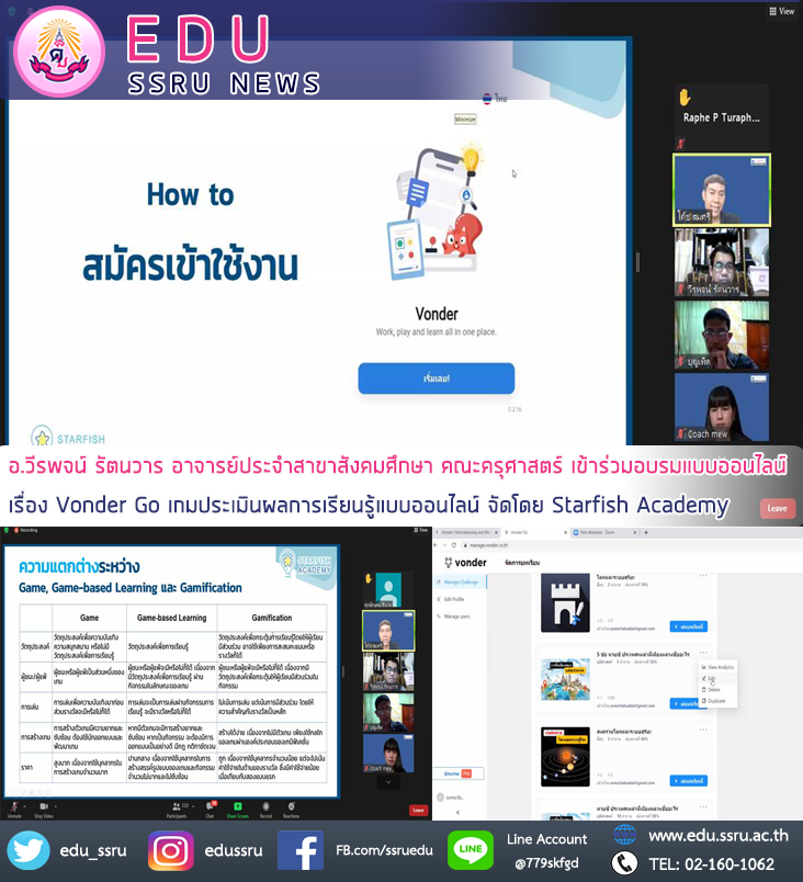 วันที่ 12 มิถุนายน 2564 อาจารย์วีรพจน์ รัตนวาร อาจารย์ประจำสาขาสังคมศึกษา คณะครุศาสตร์ มหาวิทยาลัยราชภัฏสวนสุนันทา เข้าร่วมอบรมแบบออนไลน์ เรื่อง “Vonder Go เกมประเมินผลการเรียนรู้แบบออนไลน์” จัดโดย Starfish Academy