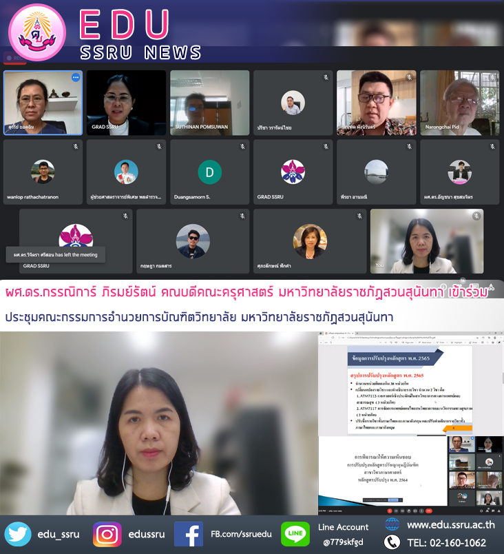 วันที่ 14 มิถุนายน 2564 ผู้ช่วยศาสตราจารย์ ดร.กรรณิการ์ ภิรมย์รัตน์ คณบดีคณะครุศาสตร์ มหาวิทยาลัยราชภัฏสวนสุนันทา เข้าร่วมประชุมออนไลน์คณะกรรมการอำนวยการบัณฑิตวิทยาลัย มหาวิทยาลัยราชภัฏสวนสุนันทา