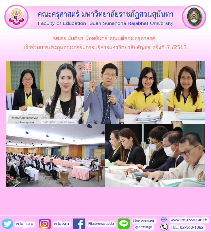 วันที่ 14 กรกฏาคม 2563 รองศาสตราจารย์ ดร.นันทิยา น้อยจันทร์ คณบดีคณะครุศาสตร์ อาจารย์ ดร.กรรณิการ์ ภิรมย์รัตน์ รองคณบดีฝ่ายวิจัย เข้าร่วมการประชุมคณะกรรมการบริหารมหาวิทยาลัยสัญจร ครั้งที่ 7 /2563 ณ ห้องประชุมหาดทรายแกรนด์ โรงแรมลองบีชชะอำ จังหวัดเพชรบุรี