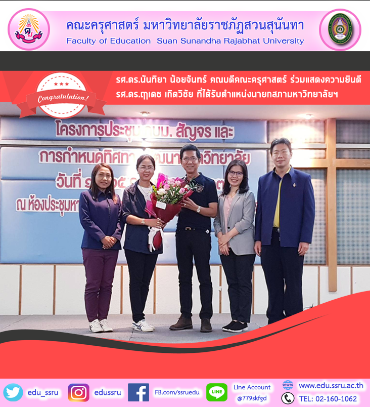 รองศาสตราจารย์ ดร.นันทิยา น้อยจันทร์ คณบดีคณะครุศาสตร์ ร่วมแสดงความยินดี กับรองศาสตราจารย์ ดร.ฤๅเดช เกิดวิชัย ที่ได้รับพระบรมราชโองการโปรดเกล้าแต่งตั้งให้ดำรงตำแหน่งเป็นนายกสภามหาวิทยาลัยราชภัฏสวนสุนันทา
