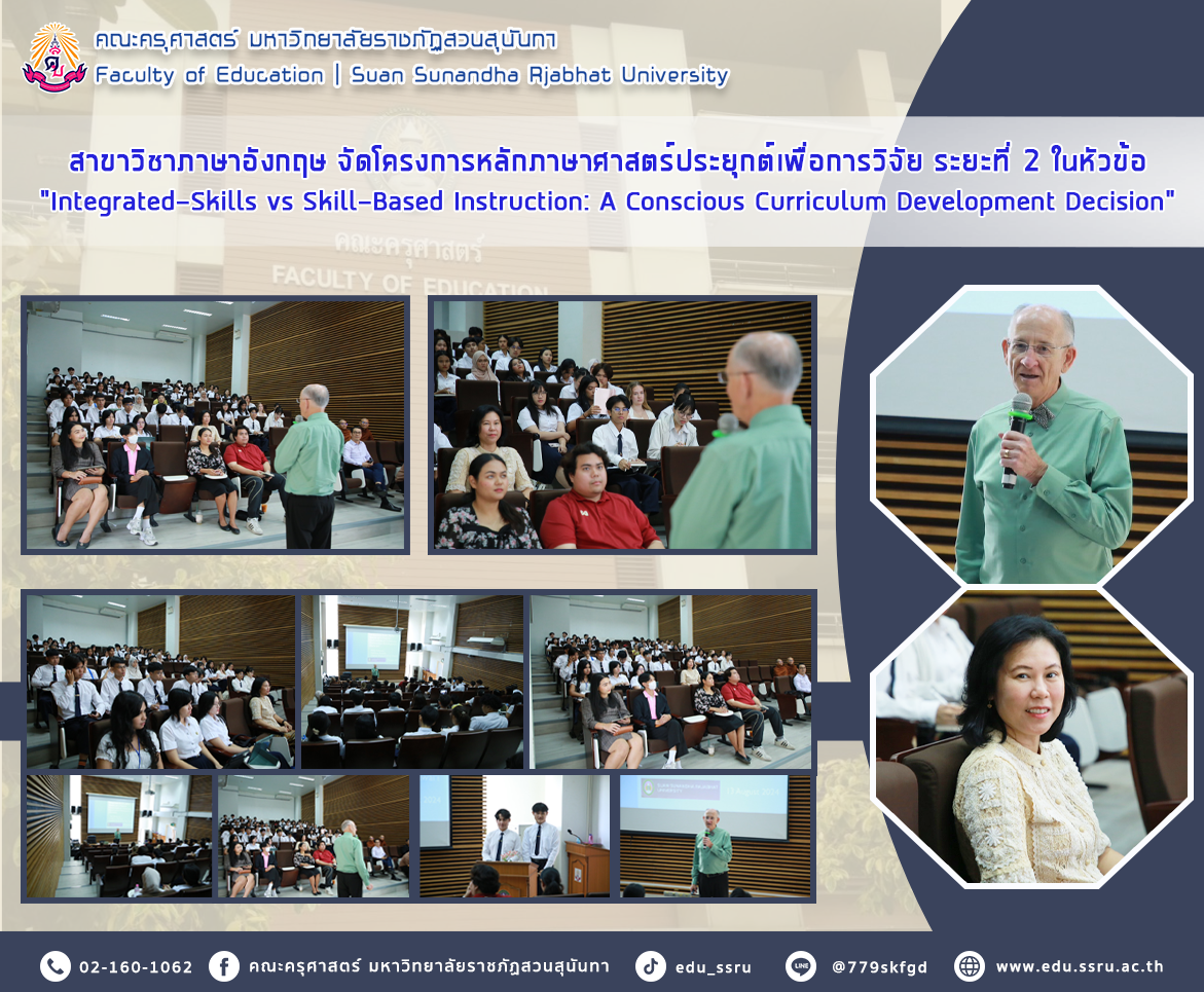 เมื่อวันที่ 13 สิงหาคม 2567 ผู้ช่วยศาสตราจารย์ ดร.ศศิพร พงศ์เพลินพิศ อาจารย์สาขาวิชาภาษาอังกฤษ คณะครุศาสตร์ มหาวิทยาลัยราชภัฏสวนสุนันทา จัดโครงการหลักภาษาศาสตร์ประยุกต์เพื่อการวิจัย ระยะที่ 2 การอบรมเชิงปฏิบัติการในหัวข้อ “Integrated-Skills vs Skill-Based Instruction: A Conscious Curriculum Development Decision” โดย Professor Neil Anderson จาก Brigham Young University - Hawaii สนับสนุนโดยสำนักงานฝ่ายโปรแกรมการเรียนการสอนภาษาอังกฤษประจำภูมิภาค (Regional English Language Office: RELO) สถานทูตสหรัฐฯและสถานกงสุลในประเทศไทย ณ คณะครุศาสตร์ มหาวิทยาลัยราชภัฏสวนสุนันทา