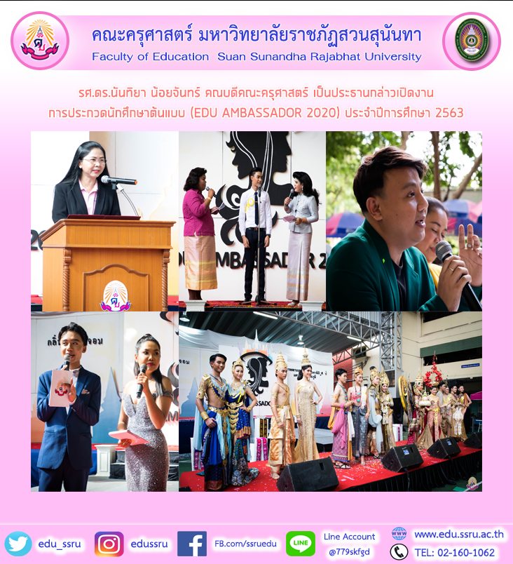 วันที่ 12 กันยายน 2563 รองศาสตราจารย์ ดร.นันทิยา น้อยจันทร์ คณบดีคณะครุศาสตร์ มหาวิทยาลัยราชภัฏสวนสุนันทา พร้อมด้วย อาจารย์ ดร.กรรณิการ์ ภิรมย์รัตน์ รองคณบดีฝ่ายวิจัยและบริการวิชาการ และอาจารย์สงกราณต์ ขุนทิพย์ทอง รองคณบดีฝ่ายกิจการนักศึกษา เป็นประธานกล่าวเปิดงานการประกวดนักศึกษาต้นแบบ (EDU AMBASSADOR 2020) ประจำปีการศึกษา 2563 โดยนักศึกษาชนะเลิศฝ่ายชายได้แก่สาขาวิชาคณิตศาสตร์ และนักศึกษาชนะเลิศฝ่ายหญิงได้แก่สาขาวิชาการศึกษาปฐมวัย ณ โรงเรียนประถมสาธิต มหาวิทยาลัยราชภัฏสวนสุนันทา