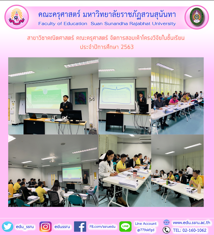 วันที่ 12 ตุลาคม 2563 สาขาวิชาคณิตศาสตร์ คณะครุศาสตร์ มหาวิทยาลัยราชภัฏสวนสุนันทา จัดการสอบเค้าโครงวิจัยในชั้นเรียน ประจำปีการศึกษา 2563 ณ ห้องเรียน 1142 และ 1146
