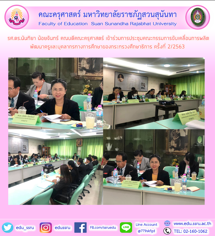 วันที่ 14 ตุลาคม 2563 รองศาสตราจารย์ ดร.นันทิยา น้อยจันทร์ คณบดีคณะครุศาสตร์ มหาวิทยาลัยราชภัฏสวนสุนันทา เข้าร่วมการประชุมคณะกรรมการขับเคลื่อนการผลิตพัฒนาครูและบุคลากรทางการศึกษาของกระทรวงศึกษาธิการ ครั้งที่ 2/2563 ณ ห้องประชุมพิพิธภัณฑ์จอมพล ป.พิบุลย์สงคราม โรงเรียนพิบูลประชาสรรค์