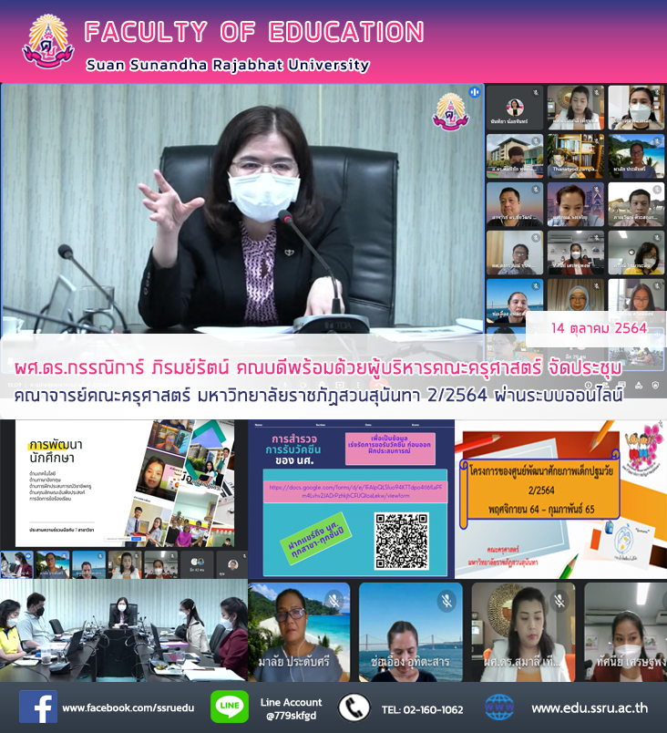 วันที่ 14 ตุลาคม 2564 ผู้ช่วยศาสตราจารย์ ดร.กรรณิการ์ ภิรมย์รัตน์ คณบดี พร้อมด้วยรองคณบดีทุกฝ่าย อาจารย์ ดร.ดวงกมล จงเจริญ ผู้อำนวยการศูนย์พัฒนาวิชาชีพทางการศึกษา ผู้ช่วยศาสตราจารย์ สุพันธ์วดี ไวยรูป ผู้อำนวยการศูนย์พัฒนาศักยภาพเด็กปฐมวัย และคณาจารย์คณะครุศาสตร์ มหาวิทยาลัยราชภัฏสวนสุนันทา จัดประชุมคณาจารย์คณะครุศาสตร์ มหาวิทยาลัยราชภัฏสวนสุนันทา 2/2564 ผ่านระบบออนไลน์