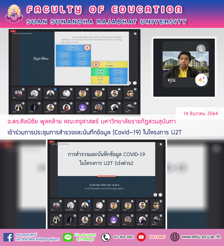 วันที่ 14 ธันวาคม 2564 อาจารย์ ดร.ศิลป์ชัย พูลคล้าย คณะครุศาสตร์ มหาวิทยาลัยราชภัฏสวนสุนันทา เข้าร่วมการประชุมการสำรวจและบันทึกข้อมูล (Covid-19) ในโครงการ U2T ในรูปแบบออนไลน์