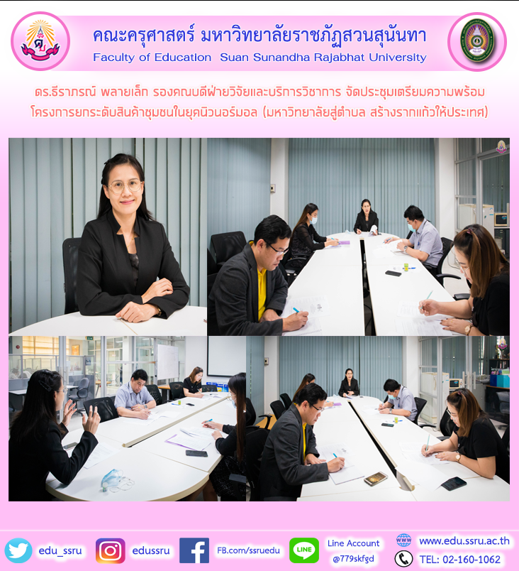 วันที่ 15 กุมภาพันธ์ 2564 ดร.ธีราภรณ์ พลายเล็ก รองคณบดีฝ่ายวิจัยและบริการวิชาการ คณะครุศาสตร์ มหาวิทยาลัยราชภัฏสวนสุนันทา จัดประชุมเตรียมความพร้อมโครงการยกระดับสินค้าชุมชนในยุคนิวนอร์มอล (มหาวิทยาลัยสู่ตำบล สร้างรากแก้วให้ประเทศ) ณ ห้องประชุมกรรณาภรณ์ ชั้น 3 สำนักงานคณะครุศาสตร์