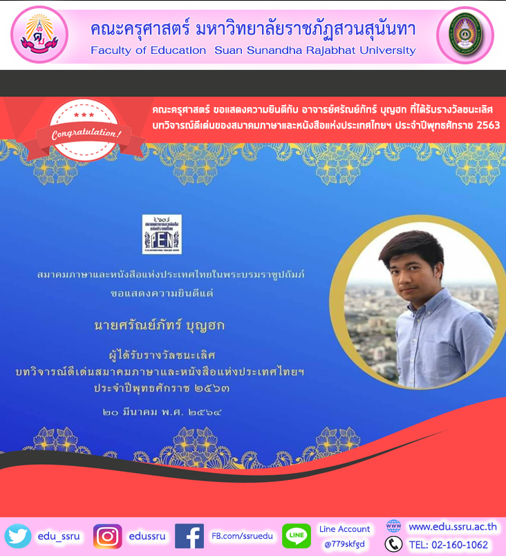 คณะครุศาสตร์ มหาวิทยาลัยราชภัฏสวนสุนันทา ขอแสดงความยินดีกับ อาจารย์ศรัณย์ภัทร์ บุญฮก อาจารย์ประจำสาขาวิชาภาษาไทย ที่ได้รับรางวัลชนะเลิศบทวิจารณ์ดีเด่นของสมาคมภาษาและหนังสือแห่งประเทศไทยฯ ประจำปีพุทธศักราช 2563 กำหนดการพิธีมอบรางวัลในวันประชุมใหญ่สมาคมภาษาและหนังสือฯ เสาร์ที่ ๒๐ มีนาคม ๒๕๖๔ เวลา ๑๓-๑๖ น. ณ หอศิลปวัฒนธรรมแห่งกรุงเทพมหานคร สี่แยกปทุมวัน ขอเชิญสมาชิกสมาคมฯและผู้สนใจทุกท่านเข้าร่วมงานโดยไม่มีค่าใช้จ่าย