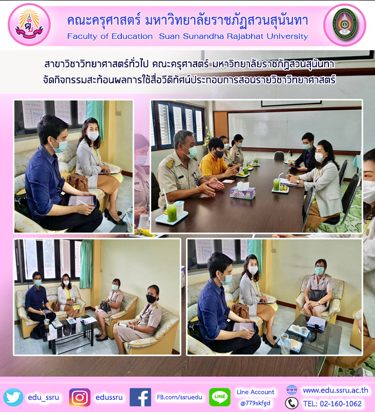 วันที่ 15 มีนาคม 2564 สาขาวิชาวิทยาศาสตร์ทั่วไป คณะครุศาสตร์ มหาวิทยาลัยราชภัฏสวนสุนันทา จัดกิจกรรมสะท้อนผลการใช้สื่อวีดิทัศน์ประกอบการสอนรายวิชาวิทยาศาสตร์ ณ โรงเรียนวัดนิยมธรรมวนาราม และโรงเรียนวัดตะโกสูง (เหรียญอุปถัมภ์) จ.นครปฐม