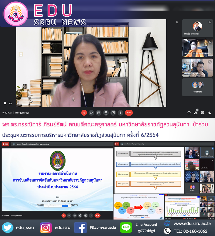 วันที่ 15 มิถุนายน 2564 ผู้ช่วยศาสตราจารย์ ดร.กรรณิการ์ ภิรมย์รัตน์ คณบดีคณะครุศาสตร์ มหาวิทยาลัยราชภัฏสวนสุนันทา เข้าร่วมประชุมออนไลน์คณะกรรมการบริหารมหาวิทยาลัยราชภัฏสวนสุนันทา ครั้งที่ 6/2564