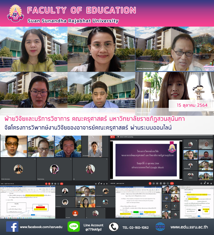 วันที่ 15 ตุลาคม 2564 นำโดย อาจารย์ ดร.ธีราภรณ์ พลายเล็ก รองคณบดีฝ่ายวิจัยและบริการวิชาการ คณะครุศาสตร์ มหาวิทยาลัยราชภัฏสวนสุนันทา จัดโครงการวิพากษ์งานวิจัยของอาจารย์คณะครุศาสตร์ ผ่านระบบออนไลน์ วัตถุประสงค์ของโครงการ เพื่อพัฒนาชุดโครงการวิจัยทางการศึกษาของอาจารย์คณะครุศาสตร์และเพื่อวิพากษ์และประเมินชุดโครงการวิจัยทางการศึกษาของอาจารย์คณะครุศาสตร์ โดยได้รับเกียรติจากผู้ทรงคุณวุฒิวิพากษ์ชุดโครงการวิจัยทางการศึกษา รองศาสตราจารย์ ดร.วิเชียร อินทรสมพันธ์ และผู้ช่วยศาสตราจารย์ ดร.พร้อมภัค บึงบัว มาเป็นวิทยากร