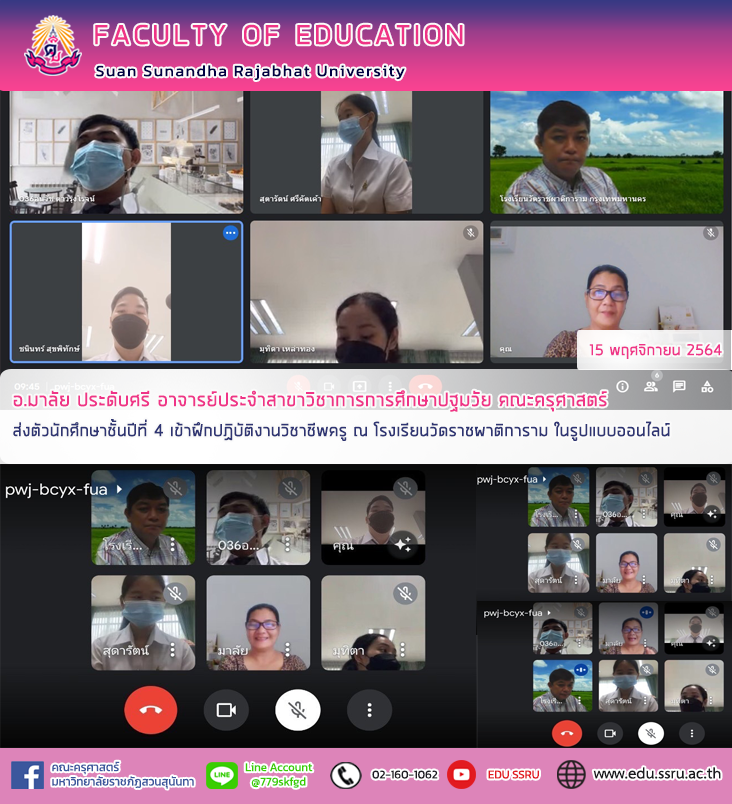 วันที่ 15 พฤศจิกายน 2564 อาจารย์มาลัย ประดับศรี อาจารย์ประจำสาขาวิชาการการศึกษาปฐมวัย คณะครุศาสตร์ มหาวิทยาลัยราชภัฏสวนสุนันทา ส่งตัวนักศึกษาชั้นปีที่ 4 เข้าฝึกปฏิบัติงานวิชาชีพครู ดังนี้ สาขาวิชาคณิตศาสตร์ 1 คน สาขาวิชาภาษาไทย 2 คน สาขาวิชาเทคโนโลยีดิจิทัลเพื่อการศึกษา 1 คน ณ โรงเรียนวัดราชผาติการาม ในรูปแบบออนไลน์