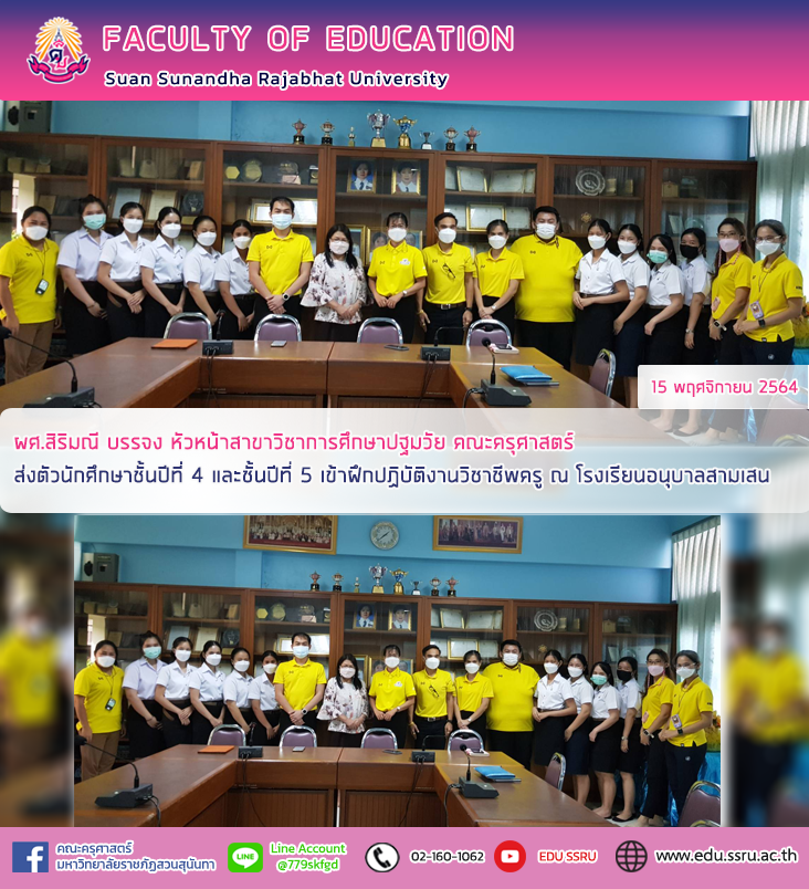 วันที่ 15 พฤศจิกายน 2564 ผู้ช่วยศาสตราจารย์สิริมณี บรรจง หัวหน้าสาขาวิชาการศึกษาปฐมวัย คณะครุศาสตร์ มหาวิทยาลัยราชภัฏสวนสุนันทา ส่งตัวนักศึกษาชั้นปีที่ 4 และชั้นปีที่ 5 เข้าฝึกปฏิบัติงานวิชาชีพครู ณ โรงเรียนอนุบาลสามเสน (สำนักงานสลากกินแบ่งรัฐบาลอุปถัมป์) โดยมี ผอ.ดารณี คุณอนันต์ ผู้อำนวยการ รองผู้อำนวยการ หัวหน้าสายชั้นปฐมวัย และครูพี่เลี้ยง ให้การต้อนรับ