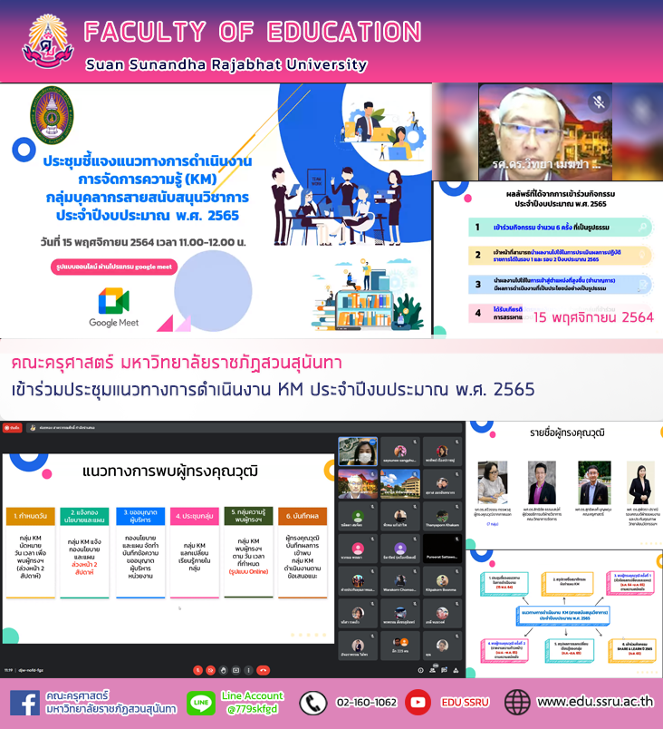 วันที่ 15 พฤศจิกายน 2564 บุคลากร คณะครุศาสตร์ มหาวิทยาลัยราชภัฏสวนสุนันทา เข้าร่วมประชุมแนวทางการดำเนินงาน KM ประจำปีงบประมาณ พ.ศ. 2565 โดยมี รองศาสตราจารย์ ดร.วิทยา เมฆขำ รองอธิการบดีฝ่ายแผนงานและประกันคุณภาพ เป็นประธานในการประชุม ซึ่งจัดขึ้นโดย กองนโยบายและแผน ในรูปแบบออนไลน์ผ่าน Google Meet