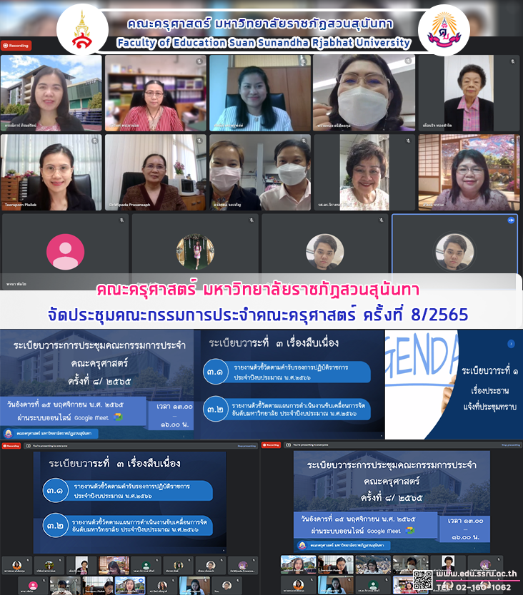 วันอังคารที่ 15 พฤศจิกายน 2565 เวลา 13.00 - 16.00 น. คณะครุศาสตร์ มหาวิทยาลัยราชภัฏสวนสุนันทา จัดประชุมคณะกรรมการประจำคณะครุศาสตร์ ครั้งที่ 8/2565 นำโดย ผู้ช่วยศาสตราจารย์ ดร.กรรณิการ์ ภิรมย์รัตน์ คณบดีคณะครุศาสตร์ พร้อมด้วยกรรมการประจำคณะและเลขานุการ และได้รับเกียรติจาก รองศาสตราจารย์ ดร.จิราภรณ์ ศิริทวี ผู้ช่วยศาสตราจารย์ ดร.เตือนใจ ทองสำริต และ นางทรายทอง ตรีสัตยกุล เป็นผู้ทรงคุณวุฒิ ผ่านระบบออนไลน์ Google Meet