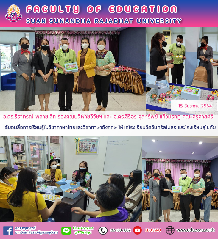 วันพุธที่ 15 ธันวาคม 2564 อาจารย์ ดร.ธีราภรณ์ พลายเล็ก รองคณบดีฝ่ายวิจัยและบริการวิชาการ และ อาจารย์ ดร.สิริอร จุลทรัพย์ แก้วมรกฎ อาจารย์ประจำสาขาวิชาภาษาไทย คณะครุศาสตร์ มหาวิทยาลัยราชภัฏสวนสุนันทา ได้มอบสื่อการเรียนรู้ในวิชาภาษาไทยและวิชาภาษาอังกฤษ ให้แก่โรงเรียนวัดจันทร์สโมสร และโรงเรียนสุโขทัย สำนักงานเขตดุสิต กรุงเทพมหานคร ซึ่งเป็นกิจกรรมภายใต้โครงการถ่ายทอดองค์ความรู้ที่ได้จากการวิจัยนวัตกรรมและงานวิชาการเพื่อการพัฒนาชุมชน