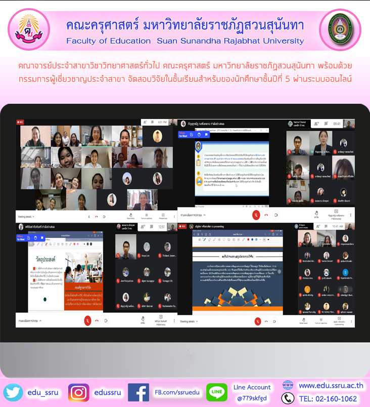 วันที่ 15 กุมภาพันธ์ 2564 คณาจารย์ประจำสาขาวิชาวิทยาศาสตร์ทั่วไป คณะครุศาสตร์ มหาวิทยาลัยราชภัฏสวนสุนันทา พร้อมด้วยกรรมการผู้เชี่ยวชาญประจำสาขา จัดสอบวิจัยในชั้นเรียนสำหรับของนักศึกษาชั้นปีที่ 5 ผ่านระบบออนไลน์