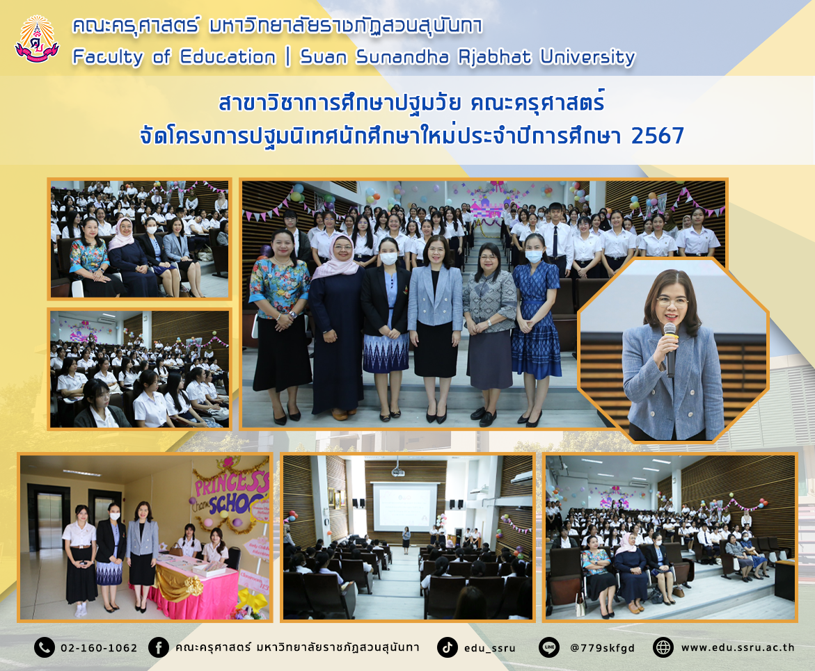 เมื่อวันที่ 12 กรกฎาคม 2567 สาขาวิชาการศึกษาปฐมวัย คณะครุศาสตร์ มหาวิทยาลัยราชภัฏสวนสุนันทา จัดโครงการปฐมนิเทศนักศึกษาใหม่ประจำปีการศึกษา 2567 โดยได้รับเกียรติจาก ผู้ช่วยศาสตราจารย์ดร.กรรณิการ์ ภิรมย์รัตน์ คณบดีคณะครุศาสตร์ และอาจารย์ประจำหลักสูตร กล่าวต้อนรับ นักศึกษา