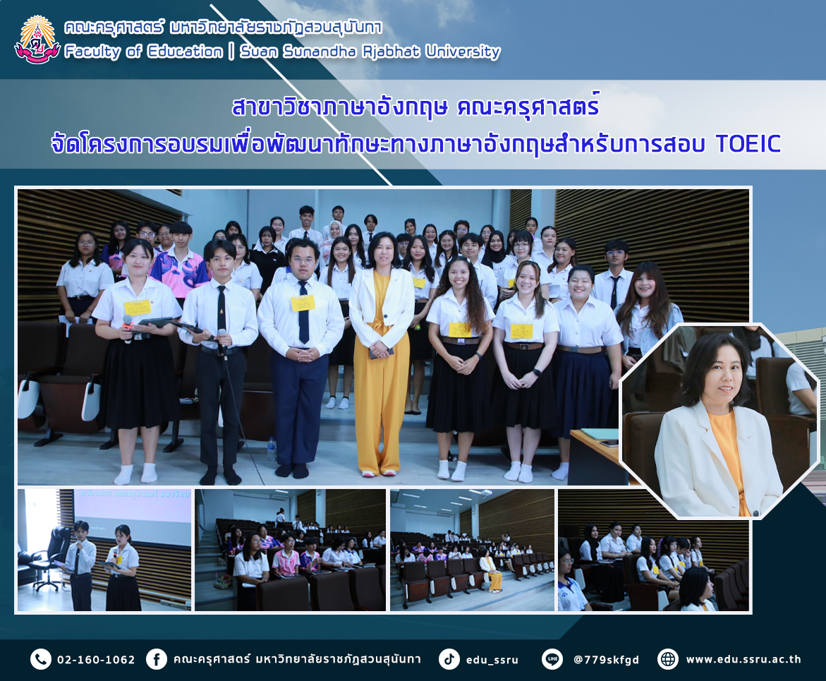 วันที่ 16 สิงหาคม 2567 คณะครุศาสตร์ มหาวิทยาลัยราชภัฏสวนสุนันทา นำโดย ผู้ช่วยศาสตราจารย์ ดร. ศศิพร พงศ์เพลินพิศ จัดโครงการอบรมเพื่อพัฒนาทักษะทางภาษาอังกฤษสำหรับการสอบ TOEIC ณ ห้อง 1137