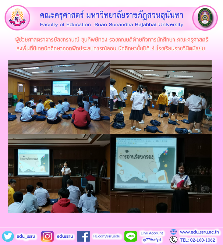 วันที่ 16 ธันวาคม 2563 ผู้ช่วยศาสตราจารย์สงกรานณ์ ขุนทิพย์ทอง รองคณบดีฝ่ายกิจการนักศึกษา คณะครุศาสตร์ มหาวิทยาลัยราชภัฏสวนสุนันทา ลงพื้นที่นิเทศนักศึกษาออกฝึกประสบการณ์สอน นักศึกษาชั้นปีที่ 4 สาขาวิชาภาษาไทย ณ โรงเรียนราชวินิตมัธยม