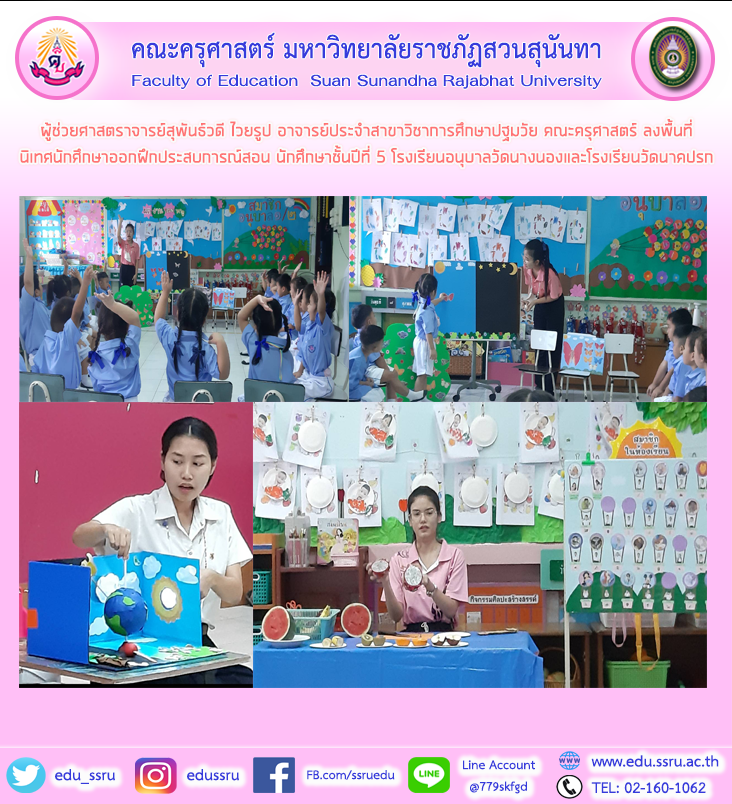 วันที่ 16 ธันวาคม 2563 ผู้ช่วยศาสตราจารย์สุพันธ์วดี ไวยรูป อาจารย์ประจำสาขาวิชาการศึกษาปฐมวัย คณะครุศาสตร์ มหาวิทยาลัยราชภัฏสวนสุนันทา ลงพื้นที่นิเทศนักศึกษาออกฝึกประสบการณ์สอน นักศึกษาชั้นปีที่ 5 สาขาวิชาการศึกษาปฐมวัย ณ โรงเรียนอนุบาลวัดนางนอง และโรงเรียนวัดนาคปรก