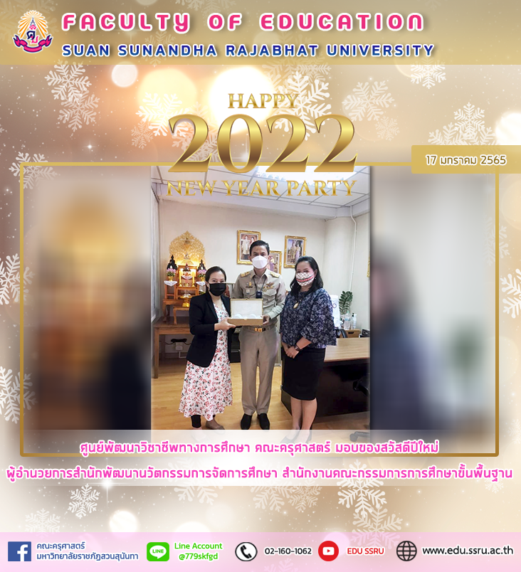 วันที่ 17 มกราคม 2565 อาจารย์ ดร.ดวงกมล จงเจริญ ผู้อำนวยการศูนย์พัฒนาวิชาชีพทางการศึกษา และอาจารย์ฐิติกาญจน์ ฐิติโสภณศักดิ์ อาจารย์ประจำสาขาวิชาการศึกษาปฐมวัย คณะครุศาสตร์ มหาวิทยาลัยราชภัฏสวนสุนันทา เข้ามอบของสวัสดีปีใหม่ ดร.ภูธร จันทะหงษ์ ปุณยจรัสธำรง ผู้อำนวยการสำนักพัฒนานวัตกรรมการจัดการศึกษา สำนักงานคณะกรรมการการศึกษาขั้นพื้นฐาน