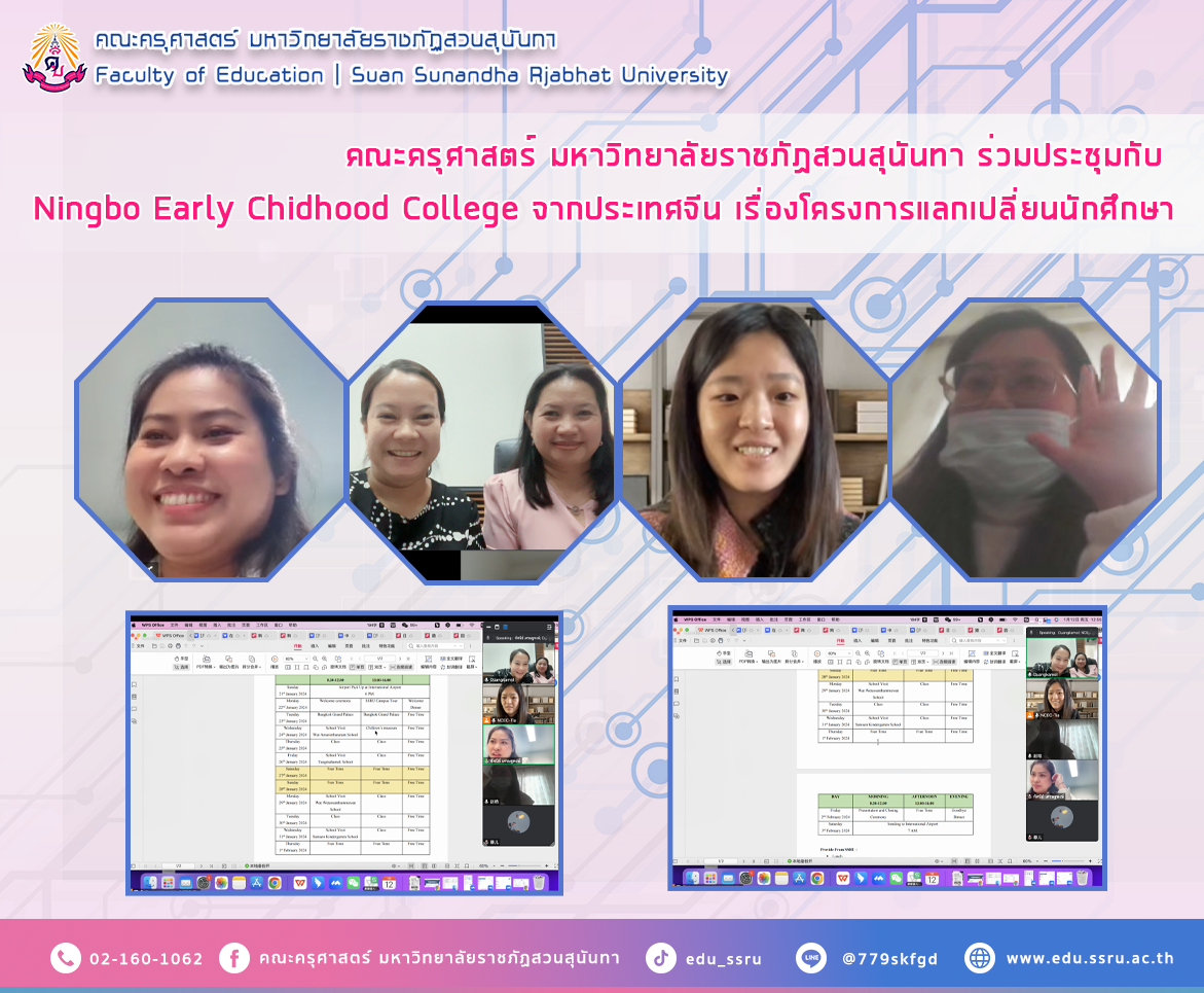 วันที่ 17 มกราคม 2567 นำโดย ผู้ช่วยศาสตราจารย์ ดร.ทัศนีย์ เศรษฐพงษ์ รองคณบดีฝ่ายวิชาการ อาจารย์ ดร.ดวงกมล จงเจริญ ผู้อำนวยการศูนย์พัฒนาวิชาชีพทางการศึกษา และอาจารย์ธิติกาญจน์ ฐิติโสภณศักดิ์ หัวหน้าสาขาวิชาการศึกษาปฐมวัย คณะครุศาสตร์ มหาวิทยาลัยราชภัฏสวนสุนันทา ร่วมประชุมกับ Ningbo Early Chidhood College จากประเทศจีน เรื่องโครงการแลกเปลี่ยนนักศึกษา ระหว่างวันที่ 22 มกราคม - 2 กุมภาพันธ์ 2567 โดยมีนักศึกษาจีนจำนวน 12 คน และอาจารย์จำนวน 2 คน มาแลกเปลี่ยนเรียนรู้ภายใต้โครงการแลกเปลี่ยนนักศึกษานานาชาติ ณ คณะครุศาสตร์