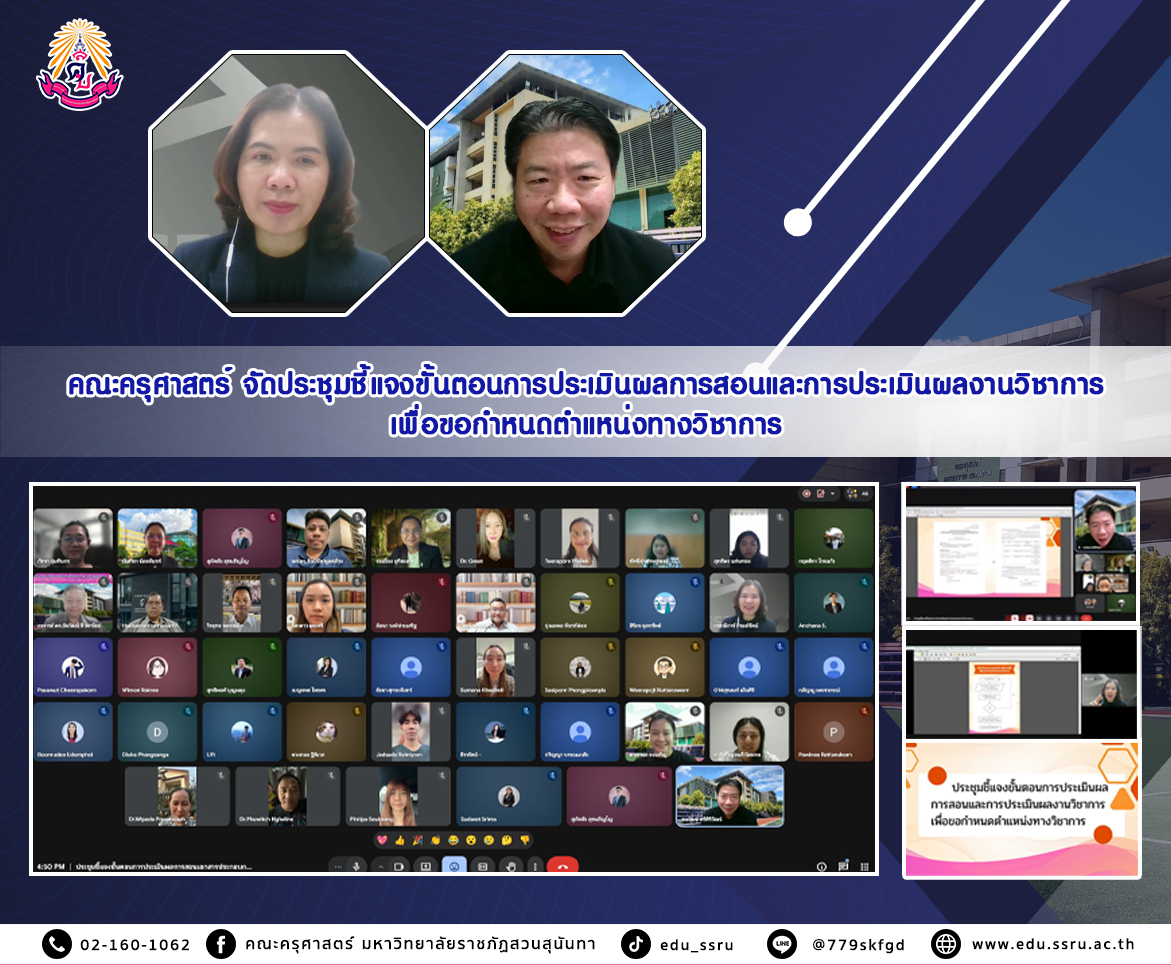 เมื่อวันที่ 14 มกราคม 2569 คณะครุศาสตร์ มหาวิทยาลัยราชภัฏสวนสุนันทา นำโดย ผู้ช่วยศาสตราจารย์ ดร. ธนวัฒน์ ศรีศิริวัฒน์ รองคณบดีฝ่ายบริหาร จัดประชุมชี้แจงขั้นตอนการประเมินผลการสอนและการประเมินผลงานวิชาการเพื่อขอกำหนดตำแหน่งทางวิชาการ โดยมี ผู้ช่วยศาสตราจารย์ ดร.กรรณิการ์ ภิรมย์รัตน์ เป็นประธาน ในรูปแบบออนไลน์