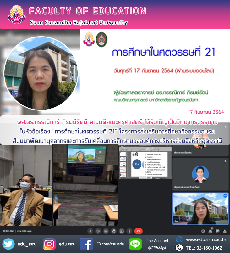วันที่ 17 กันยายน 2564 ผู้ช่วยศาสตราจารย์ ดร.กรรณิการ์ ภิรมย์รัตน์ คณบดีคณะครุศาสตร์ มหาวิทยาลัยราชภัฏสวนสุนันทา ได้รับเชิญเป็นวิทยากรบรรยายในหัวข้อเรื่อง “การศึกษาในศตวรรษที่ 21” โครงการส่งเสริมการศึกษา : กิจกรรมอบรมสัมมนาพัฒนาบุคลากรและการขับเคลื่อนการศึกษา ขององค์การบริหารส่วนจังหวัดอุดรธานี
