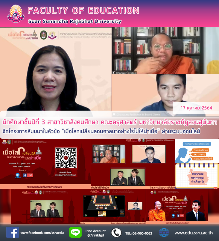 วันที่ 17 ตุลาคม 2564 นักศึกษาชั้นปีที่ 3 สาขาวิชาสังคมศึกษา คณะครุศาสตร์ มหาวิทยาลัยราชภัฏสวนสุนันทา จัดโครงการสัมมนาในหัวข้อ "เมื่อโลกเปลี่ยนสอนศาสนาอย่างไรไม่ให้น่าเบื่อ” ผ่านระบบออนไลน์ โดยได้รับเกียรติจาก ผู้ช่วยศาสตราจารย์ ดร.กรรณิการ์ ภิรมย์รัตน์ คณบดีคณะครุศาสตร์ กล่าวเปิดการจัดสัมมนา และได้รับเกียรจาก พระมหาไพรวัลย์ วรวฺณโณ และ ครูธีรวุฒิ ศรีมังคละ เจ้าของเพจ : นายแสน Facilitator & board game เป็นวิทยากรในการจัดสัมมนา