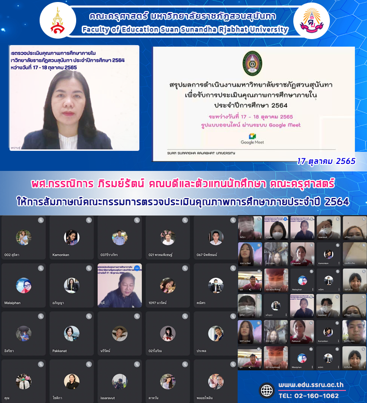 วันที่ 17 ตุลาคม 2565 คณะครุศาสตร์ มหาวิทยาลัยราชภัฏสวนสุนันทา นำโดย ผู้ช่วยศาสตราจารย์ ดร.กรรณิการ์ ภิรมย์รัตน์ คณบดีคณะครุศาสตร์ และตัวแทนนักศึกษาของคณะฯ ให้การสัมภาษณ์และนำเสนอผลงานของคณะฯ แก่ รองศาสตราจารย์ จันทนี เพชรานนท์ คณะกรรมการตรวจประเมินคุณภาพการศึกษาภายประจำปี 2564 ในรูปแบบออนไลน์ ผ่าน Google Meet