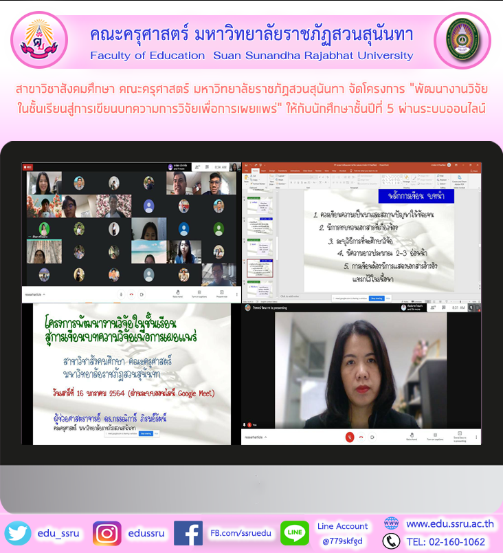 วันที่ 16 มกราคม 2564 สาขาวิชาสังคมศึกษา คณะครุศาสตร์ มหาวิทยาลัยราชภัฏสวนสุนันทาจัด "โครงการพัฒนางานวิจัยในชั้นเรียนสู่การเขียนบทความการวิจัยเพื่อการเผยแพร่” ให้กับนักศึกษาชั้นปีที่ 5 ของสาขาฯ ผ่านการอบรมด้วยระบบออนไลน์ โดยได้รับเกียรติจาก ผู้ช่วยศาสตราจารย์ ดร.กรรณิการ์ ภิรมย์รัตน์ คณบดีคณะครุศาสตร์และอาจารย์ประจำสาขาวิชาสังคมศึกษาเป็นวิทยากร