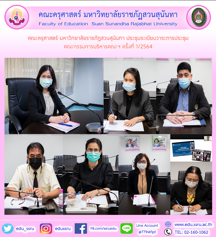 วันที่ 18 มกราคม 2564 ผู้ช่วยศาสตราจารย์ ดร.กรรณิการ์ ภิรมย์รัตน์ คณบดีคณะครุศาสตร์ มหาวิทยาลัยราชภัฏสวนสุนันทา พร้อมด้วยผู้บริหารของคณะฯ ประชุมระเบียบวาระการประชุมคณะกรรมการบริหารคณะ ครั้งที่ 1/2564 ณ ห้องประชุม 1124
