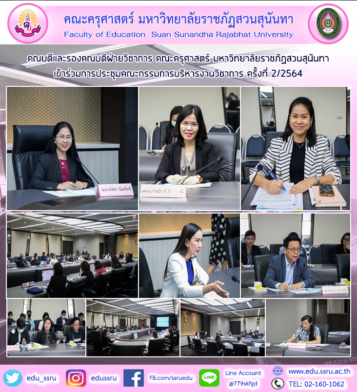 วันที่ 18 มีนาคม 2564 ผู้ช่วยศาสตราจารย์ ดร.กรรณิการ์ ภิรมย์รัตน์ คณบดี และผู้ช่วยศาสตราจารย์ ดร.ทัศนีย์ เศรษฐพงษ์ รองคณบดีฝ่ายวิชาการ คณะครุศาสตร์ มหาวิทยาลัยราชภัฏสวนสุนันทา เข้าร่วมการประชุมคณะกรรมการบริหารงานวิชาการ ครั้งที่ 2/2564 ณ ห้องประชุมสภามหาวิทยาลัย อาคาร 31 ชั้น 5