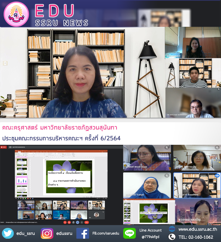 วันที่ 18 มิถุนายน 2564 ผู้ช่วยศาสตราจารย์ ดร.กรรณิการ์ ภิรมย์รัตน์ คณบดีคณะครุศาสตร์ มหาวิทยาลัยราชภัฏสวนสุนันทา พร้อมด้วยผู้บริหารของคณะฯ เข้าร่วมการประชุมระเบียบวาระการประชุมคณะกรรมการบริหารคณะฯ 6/2564 ผ่านระบบออนไลน์