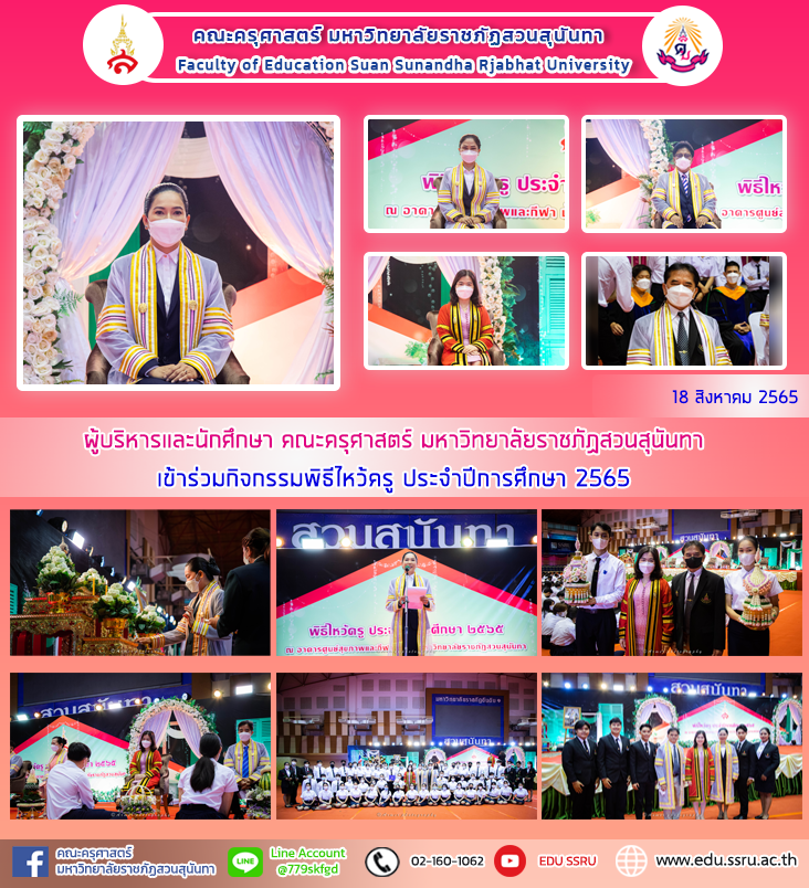 วันที่ 18 สิงหาคม 2565 นำโดย ผู้ช่วยศาสตราจารย์ ดร.กรรณิการ์ ภิรมย์รัตน์ คณบดี ผู้ช่วยศาสตราจารย์ สงกรานณ์ ขุนทิพย์ทอง รองคณบดีฝ่ายกิจการนักศึกษา พร้อมด้วย สโมสรนักศึกษา และนักศึกษา คณะครุศาสตร์ มหาวิทยาลัยราชภัฏสวนสุนันทา เข้าร่วมกิจกรรมพิธีไหว้ครู ประจำปีการศึกษา 2565 โดยมี รองศาสตราจารย์ ดร.ชุติกาญจน์ ศรีวิบูลย์ อธิการบดีมหาวิทยาลัยราชภัฏสวนสุนันทา เป็นประธานพิธี พร้อมกล่าวให้โอวาทแก่นักศึกษาที่เข้าร่วมพิธี โดยวัตถุประสงค์ในการจัดงานเพื่อแสดงความกตัญญูกตเวทีต่อครู ณ อาคารศูนย์สุขภาพเเละกีฬาสวนสุนันทา ชั้น 4