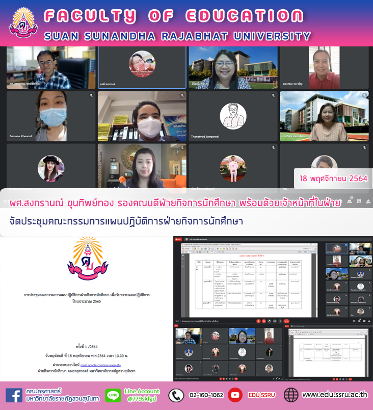 วันที่ 18 พฤศจิกายน 2564 ผู้ช่วยศาสตราจารย์สงกรานณ์ ขุนทิพย์ทอง รองคณบดีฝ่ายกิจการนักศึกษา พร้อมด้วย นายหัสถชัย นวนประสงค์ และนางสาวอรดี หอมวงศ์ เจ้าหน้าที่ฝ่ายกิจการนักศึกษา จัดประชุมคณะกรรมการแผนปฏิบัติการฝ่ายกิจการนักศึกษา เพื่อชี้แจ้งรับทราบแผนการปฏิบัติการ ปีงบประมาณ 2565 ในรูปแบบออนไลน์