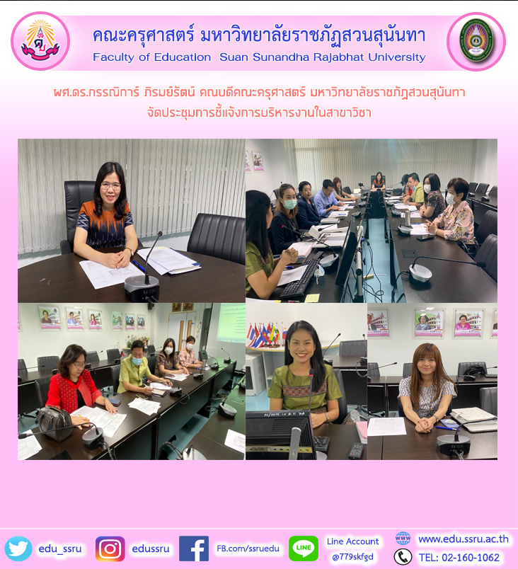 วันที่ 18 ธันวาคม 2563 ผู้ช่วยศาสตราจารย์ ดร.กรรณิการ์ ภิรมย์รัตน์ คณบดีคณะครุศาสตร์ มหาวิทยาลัยราชภัฏสวนสุนันทา จัดประชุมการชี้แจ้งการบริหารงานในสาขาวิชา ณ ห้องประชุม 1124