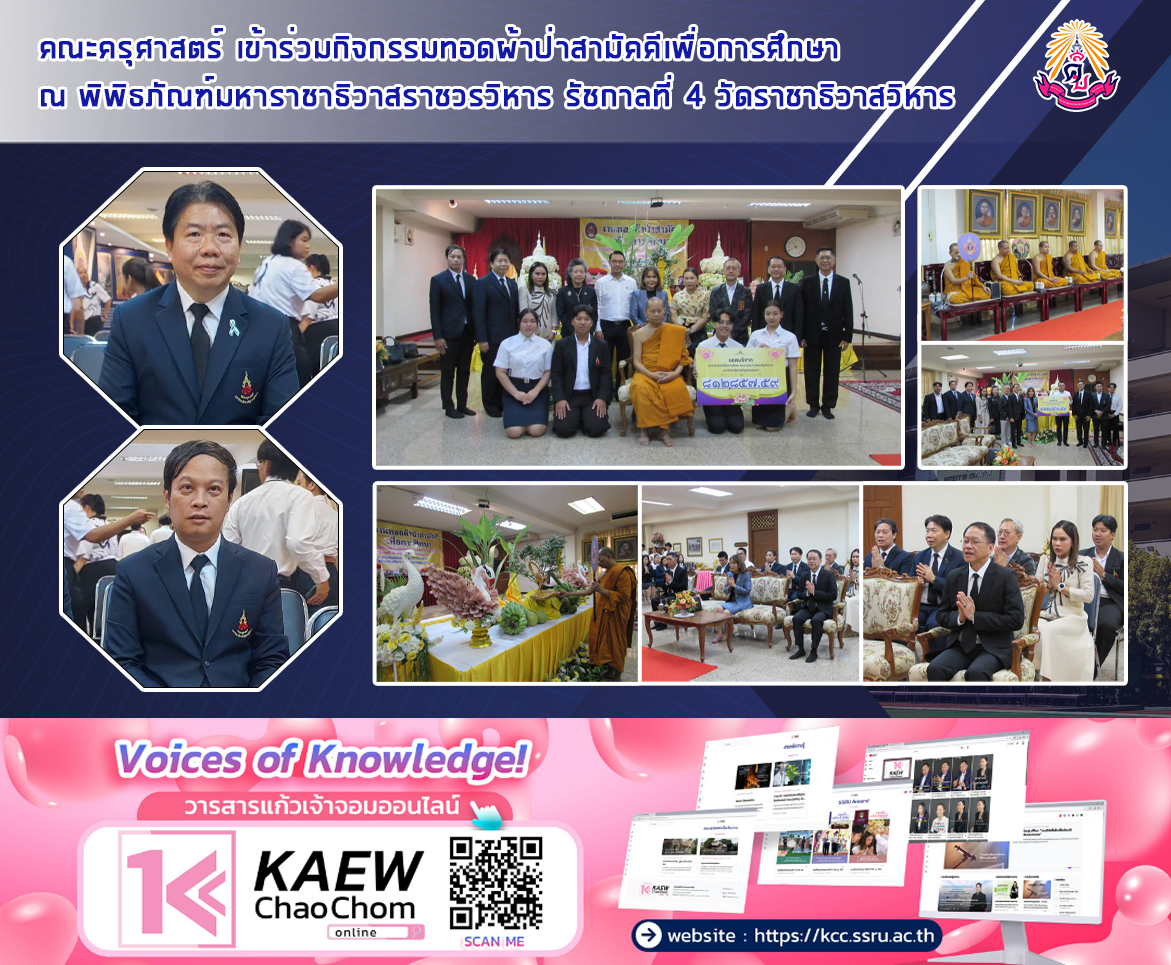 วันที่ 19 มกราคม 2569 คณะครุศาสตร์ มหาวิทยาลัยราชภัฏสวนสุนันทา นำโดย ผู้ช่วยศาสตราจารย์ ดร. ธนวัฒน์ ศรีศิริวัฒน์ รองคณบดีฝ่ายบริหาร และผู้ช่วยศาสตราจารย์ภาณุวัฒน์ ศิวะสกุลราช รองคณบดีฝ่ายกิจการนักศึกษา เข้าร่วมกิจกรรมทอดผ้าป่าสามัคคีเพื่อการศึกษา ณ พิพิธภัณฑ์มหาราชาธิวาสราชวรวิหาร รัชกาลที่ 4 วัดราชาธิวาสวิหาร เขตดุสิต กรุงเทพมหานคร เพื่อมอบเป็นทุนการศึกษาให้กับนักศึกษามหาวิทยาลัยราชภัฏสวนสุนันทาที่ขาดแคลนทุนทรัพย์ และส่งเสริมและทำนุบำรุงพระพุทธศาสนา