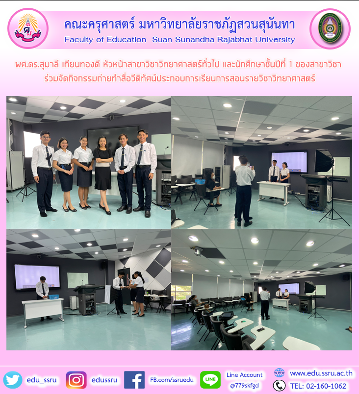 วันที่ 18 กุมภาพันธ์ 2564 ผู้ช่วยศาสตราจารย์ ดร.สุมาลี เทียนทองดี หัวหน้าสาขาวิชาวิทยาศาสตร์ทั่วไป คณะครุศาสตร์ มหาวิทยาลัยราชภัฏสวนสุนันทา และนักศึกษาชั้นปีที่ 1 ของสาขาวิชา ร่วมจัดกิจกรรมถ่ายทำสื่อวีดิทัศน์ประกอบการเรียนการสอนรายวิชาวิทยาศาสตร์ ณ ห้อง 1136