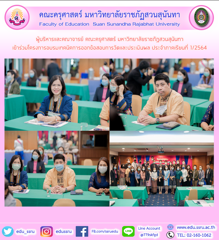 วันที่ 19 กุมภาพันธ์ 2564 ผู้ช่วยศาสตราจารย์ ดร.กรรณิการ์ ภิรมย์รัตน์ คณบดีคณะครุศาสตร์ และ อาจารย์ ดร.ศิลป์ชัย พูลคล้าย รองคณบดีฝ่ายบริหาร พร้อมด้วยคณาจารย์ของคณะฯ เข้าร่วมโครงการอบรมเทคนิคการออกข้อสอบการวัดและประเมินผล ประจำภาคเรียนที่ 1/2564 ณ ห้องสุพรรณิการ์ โรงแรมสวนสุนันทา