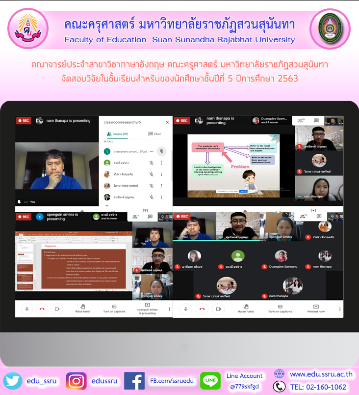 วันที่ 19 กุมภาพันธ์ 2564 คณาจารย์ประจำสาขาวิชาภาษาอังกฤษ คณะครุศาสตร์ มหาวิทยาลัยราชภัฏสวนสุนันทา จัดสอบวิจัยในชั้นเรียนสำหรับของนักศึกษาชั้นปีที่ 5 ปีการศึกษา 2563 ผ่านระบบออนไลน์ Google Meet