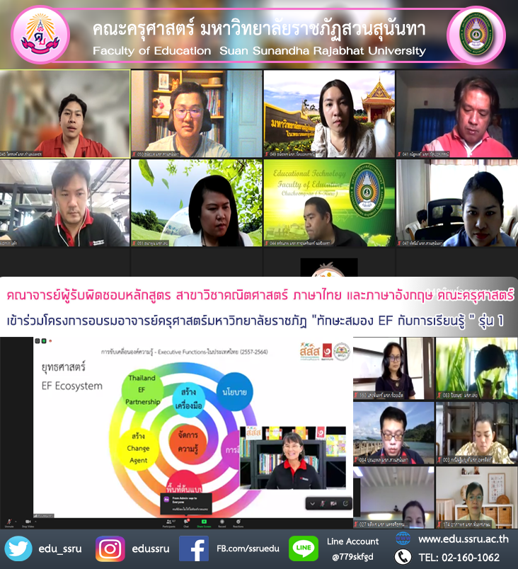 วันที่ 19 พฤษภาคม 2564 คณาจารย์ผู้รับผิดชอบหลักสูตร สาขาวิชาคณิตศาสตร์ สาขาภาษาไทย และภาษาอังกฤษ คณะครุศาสตร์ มหาวิทยาลัยราชภัฏสวนสุนันทา โดยมี ผู้ช่วยศาสตราจารย์ ดร.ธนัชยศ จำปาหวาย ผู้ช่วยศาสตราจารย์ ปุณยพล จันทร์ฝอย ผู้ช่วยศาสตราจารย์ ดร.ทัศนีย์ เศรษฐพงษ์ และ ผู้ช่วยศาสตราจารย์ ดร.ศศิพร พงศ์เพลินพิศ เข้าร่วมโครงการอบรมอาจารย์ครุศาสตร์มหาวิทยาลัยราชภัฏ “ทักษะสมอง EF กับการเรียนรู้ “ รุ่น 1